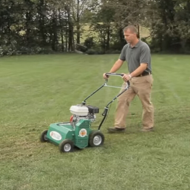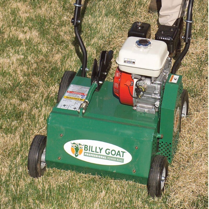 This power rake comes standard with a Honda engine coupled to a free-swinging, heat-treated, tempered flail blade reel, mounted to heavy-duty cast iron pillow block bearings with grease zerks. This unit is convertible to an overseeder or vertislicer with optional accessories.